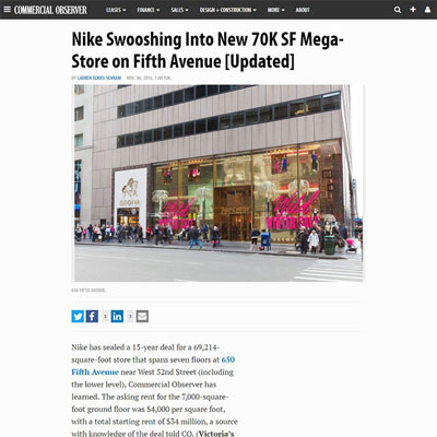 Nike has sealed a 15-year deal for a 69,214-square-foot store that spans seven floors at 650 Fifth Avenue near West 52nd Street (including the lower level), Commercial Observer has learned. The asking rent for the 7,000-square-foot ground floor was $4,000 per square foot, with a total starting rent of $34 million, a source with knowledge of the deal told CO. (Victoria’s Secret next door has 9,200 square feet at grade, with a starting rent of $31 million, the source noted.)