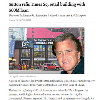 A group of investors led by Jeff Sutton refinanced a Times Square retail property occupied by Duane Reade with a $60 million loan from Bank of China. The bank is replacing a $60 million note securitized by Wells Fargo on the property at 661 Eighth Avenue that was set to mature on Jan. 11, the Commercial Observer reported. That loan carried an interest rate of roughly 5.9 percent. The new loan has a three-year term with a Libor-based floating rate that currently sits at 3 percent.